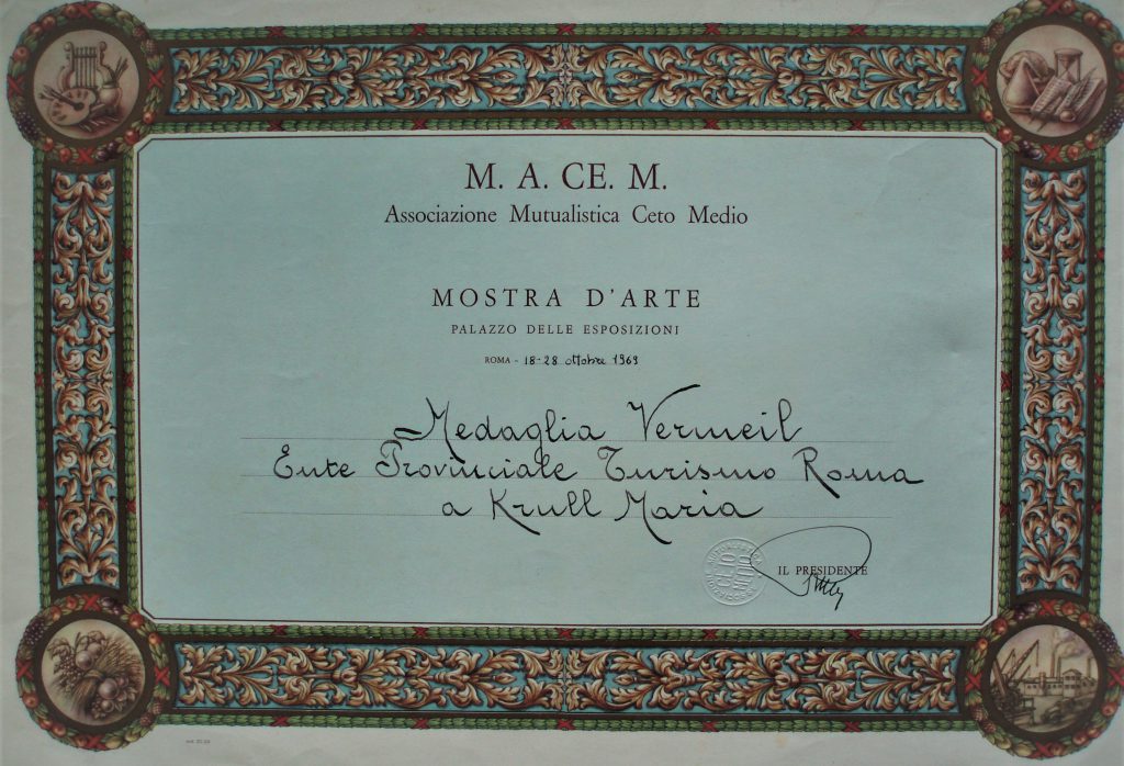 1969 – Mostra d’Arte MACEM,  Palazzo delle Esposizioni, Medaglia VERMEIL, Ente Provinciale Turismo, Roma